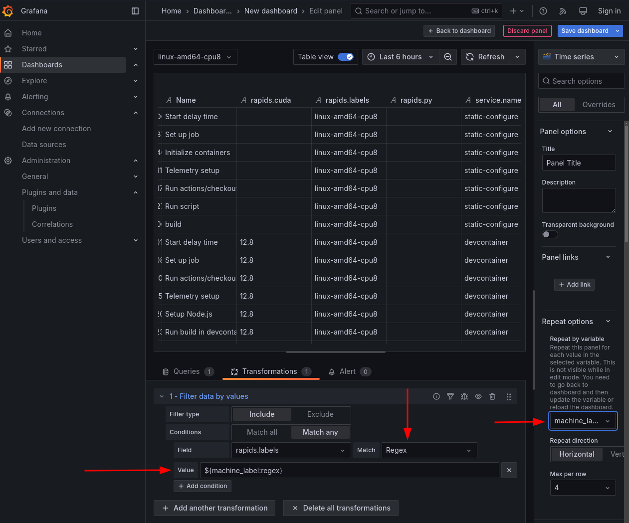 Grafana has something called “dashboard variables,” which serve to select some value for a particular dimension. Using this as the input to the data filters makes it easy to make multiple plots for different values of the variable (e.g. different machine labels or different RAPIDS repos)